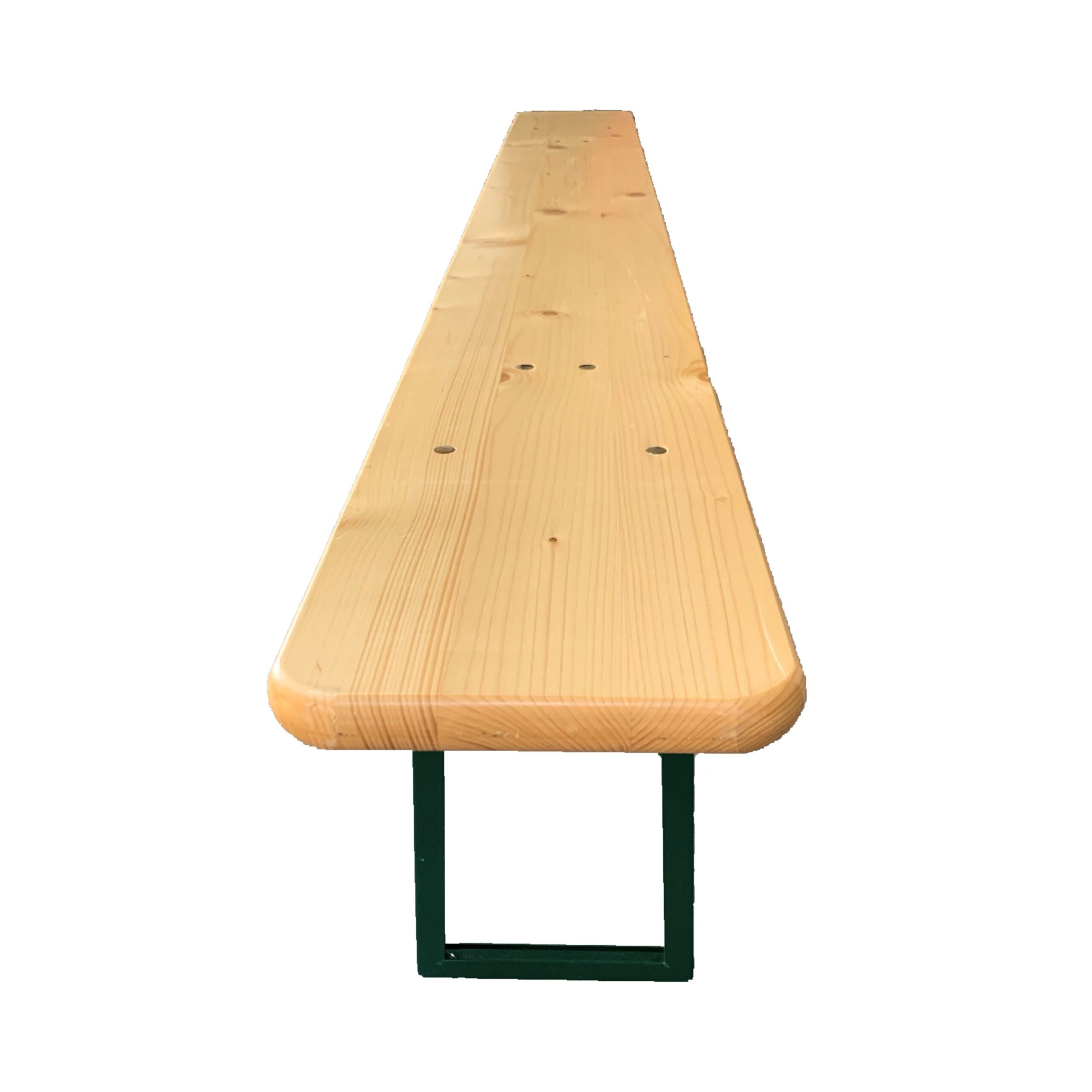 - Varnished timber bench seat with fold out, forest green metal legs